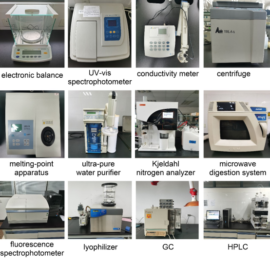 The laboratory section has a large number of equipment for different chemical experiments, including electronic balances, temperature-controlled water baths, ultra-pure water purifier, pH meters, melting point apparatuses, rotary evaporators, centrifuges, drying ovens, conductivity meters, UV-vis spectrophotometers, fluorescence spectrometer, Kjeldahl nitrogen analyzer, microwave digestion system, liquid chromatograph, gas chromatograph, gas chromatograph- mass spectrometry, etc.