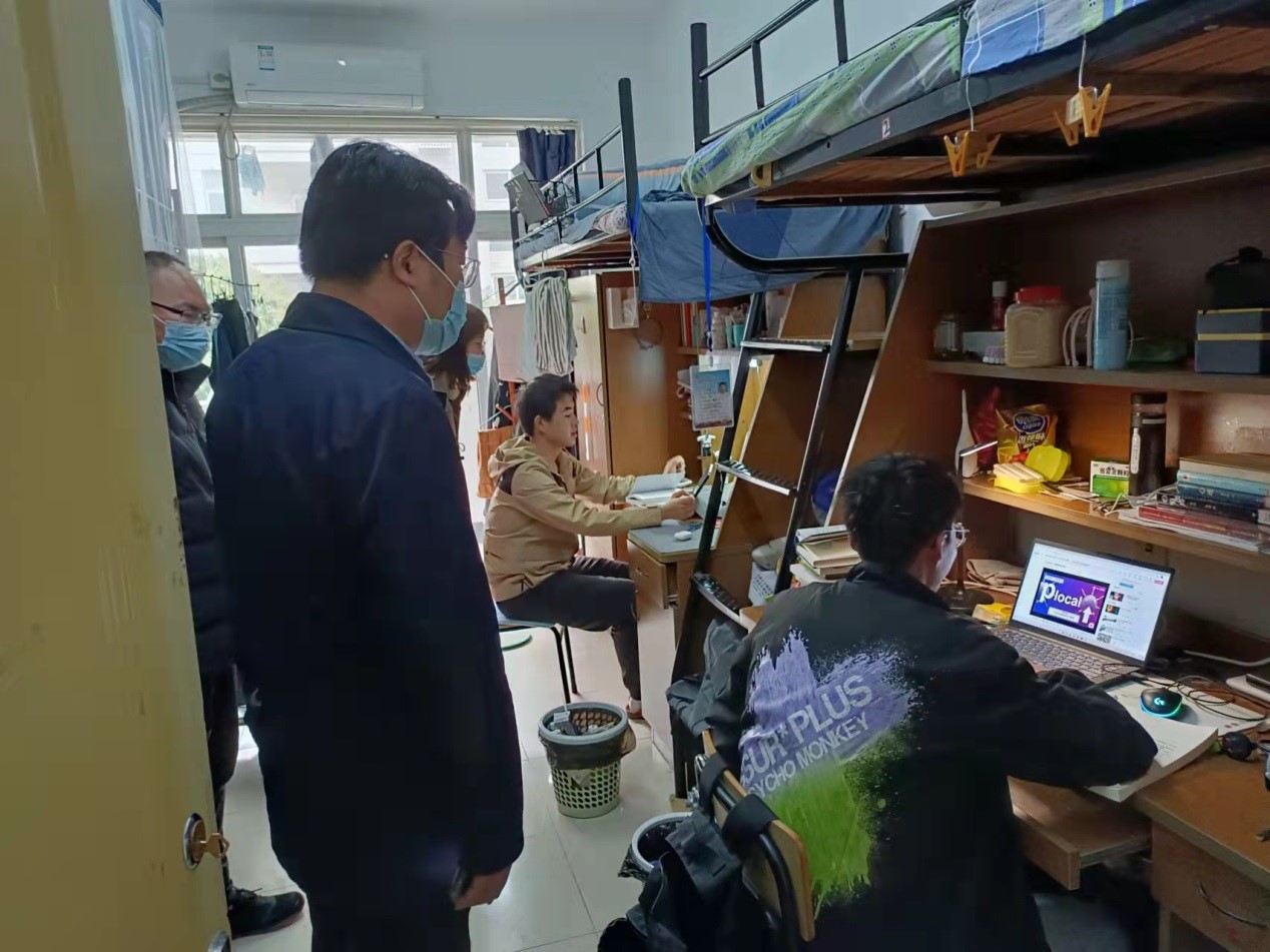 为确保疫情防控工作落到实处,及时了解同学们的思想动态及学习生活情况,让返校学生线上上课安全有序的进行,3月28日上午,学院党委副书记周进进和全体辅导员前往学生宿舍,了解同学们的学习和生活状态。