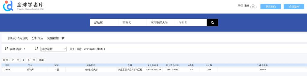 胡秋辉教授进入榜单。网站公布的统计数据显示,胡秋辉教授论文总评分429441.826710、论文篇均评分1883.516000、H指数48、论文数228,全球总排名第39568名。