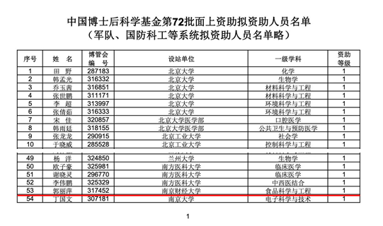 师资博士后郭丽萍获批一等资助。这是本批次资助名单中食品领域唯一的面上一等科学基金资助,也是我校第一个中国博士后科学基金一等资助。