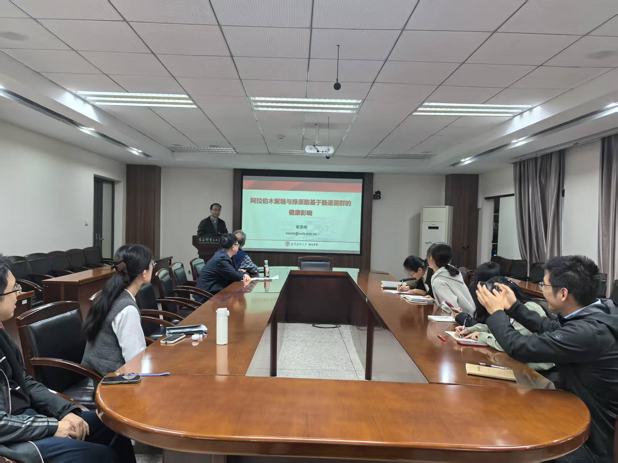 谢旻皓老师和汪振炯老师分别围绕“阿拉伯木聚糖与绿原酸基于肠道菌群的健康影响”和“环糊精超分子的食品应用-浅谈基金申请的一点心得”的作了学术报告。本次活动由沈新春教授主持,学院青年教师及部分研究生到场聆听。