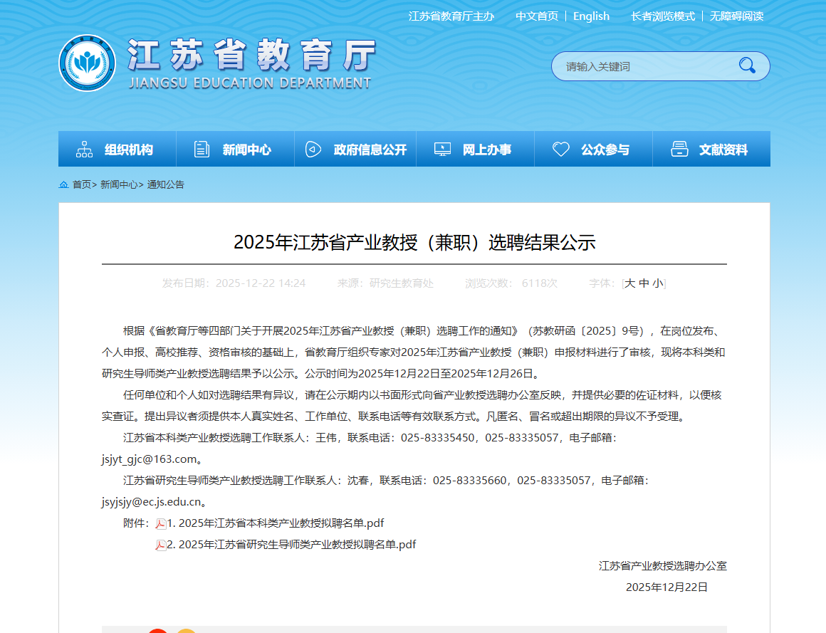 近日,江苏省教育厅、省委人才办、省科技厅、省人力资源和社会保障厅联合发布了《省教育厅等四部门关于公布2025年江苏省产业教授(兼职)选聘名单的通知》(苏教研函〔2025〕9号)。在此次选聘中,快直播体育 推荐的南京粮食集团党委副书记、总经理张荣广和常州寅盛药业有限公司执行董事陶鑫分别入选研究生导师类和本科类江苏省产业教授,为学院产学研合作与“双师型”师资队伍建设注入强劲动能。