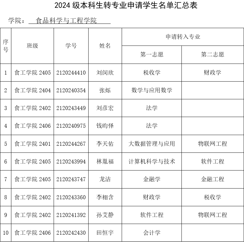 根据《南京财经大学本科生转专业管理办法》(南财大校字〔2024〕15号)、《关于2024-2025学年第二学期本科生转专业工作安排的通知》(南财教字〔2025〕18号)要求,经学生个人申请、学院转专业领导小组审核,现将2024级本科生申请转专业学生名单予以公示。
