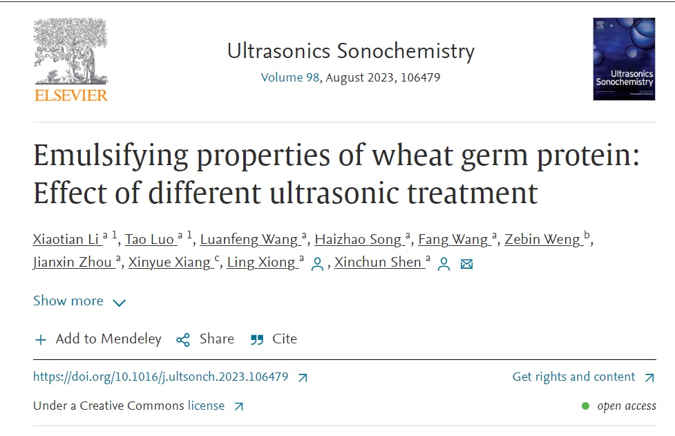 沈新春、熊玲(通讯作者)在国际TOP期刊Ultrasonics Sonochemistry(Q1,IF: 8.4)发表题为“Emulsifying properties of wheat germ protein: Effect of different ultrasonic treatment”的研究性论文。