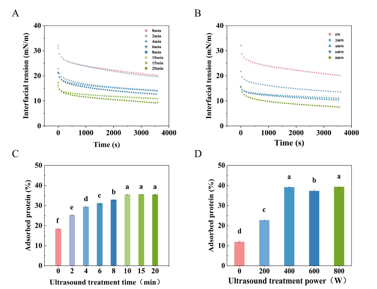 图2 超声处理后麦胚蛋白界面张力和界面吸附变化