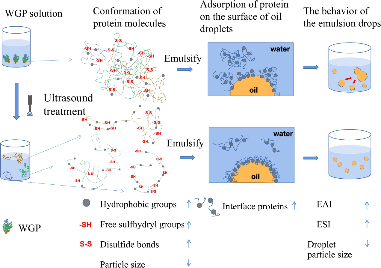 本文系统探究了碱提酸沉法提取的麦胚蛋白的乳化活性和乳化稳定性,并首次探究了超声处理是否可以提升其乳化特性以及潜在的机理。