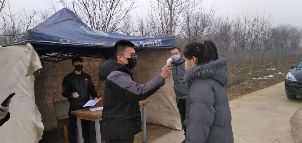 邓梦浩为来往人员测量体温