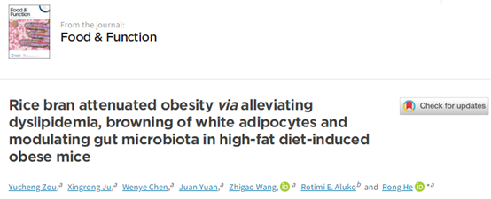 相关研究结果以Rice bran attenuated obesity via alleviating dyslipidemia, browning of white adipocytes and modulating gut microbiota in high-fat diet-induced obese mice”为题发表在Food & Function杂志上,何荣副教授为通讯作者。本研究得到国家重点研发项目的资助。