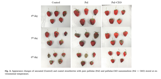 草莓果实营养丰富,拥有“水果皇后”的称号。然而,草莓成熟后表皮极薄,在采摘和储存过程中极易受到机械损伤与细菌霉菌侵染,通常情况下在常温放置3天即失水霉烂严重,失去商业价值。因此,如何维持新鲜草莓的品质,延长草莓的储藏时间一直以来都是国内外研究人员的热点问题。涂膜保鲜法因为具有操作简单易行、良好的气体选择透过性和有效防止微生物侵入等优势,成为近年来果蔬采后保鲜领域的热点研究方向。本研究以天然高分子可降解材料普鲁兰多糖为成膜基材,添加肉桂精油纳米乳液以提升复合膜的抗菌性能。对新鲜草莓涂抹保鲜的应用研究发现, 经过肉桂精油纳米乳液/普鲁兰多糖基复合膜液涂膜后的草莓,其在贮藏期结束时的重量损失、腐败率、硬度、可溶性固形物、可滴定酸和微生物指标均显著好于纯普鲁兰膜液组和对照组的草莓。实验结果表明草莓果实经过肉桂精油纳米乳液/普鲁兰多糖基复合膜液涂膜处理后,可以有效地延长贮存期,延缓衰老,并保持良好的外观品质,可见使用肉桂精油纳米乳液/普鲁兰多糖基复合膜液涂膜是一种极具潜力的保鲜手段。相关研究结果以“Improvement of storage quality of strawberries by pullulan coatings incorporated with cinnamon essential oil nanoemulsion”为题发表在LWT杂志上,快直播体育