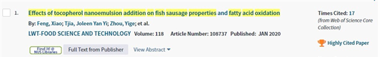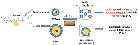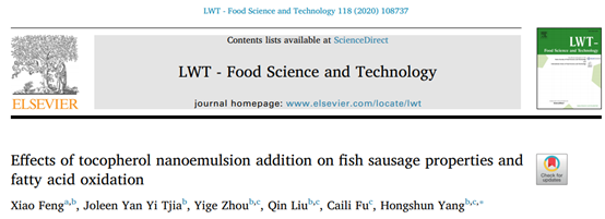 包埋维生素E的纳米乳液在鱼肠中的添加可以有效延缓鱼肉肠内油脂的氧化,并且对其中的不饱和脂肪酸起到保护作用。相比较而言,微米级的维E乳液添加对于鱼肠的脂肪氧化并没有显著的抑制作用。纳米乳液具有粒径小、分布均匀且较稳定的性质,促使维生素E发挥了显著的抗氧化作用。与此同时,研究发现纳米乳液的添加并不影响鱼肠的质构及色泽,可以广泛应用于食品工业生产中。相关研究结果以“Effects of tocopherol nanoemulson addition on fish sausage properties and fatty acid oxidation”为题发表在LWT杂志上,并入选农业科学领域ESI高被引论文。快直播体育