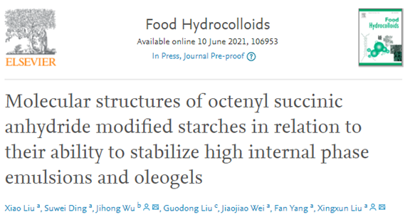 2021年6月10日,《Food Hydrocolloids》在线发表了题为“Molecular structures of octenyl succinic anhydride modified starches in relation to their ability to stabilize high internal phase emulsions and oleogels”的研究论文。该论文以南京财经大学为第一单位,刘潇博士为第一作者,刘兴训研究员为共同通讯作者。