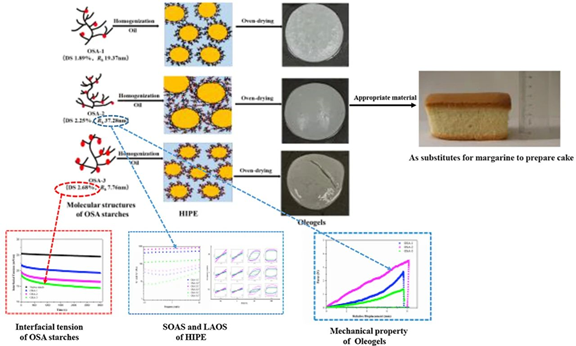 在本研究中,研究人员利用具有不同分子结构的两亲辛烯基琥珀酸酐(OSA)蜡质玉米淀粉(OSA-1、OSA-2和OSA-3)作为稳定剂用于将液态油转变为软固态高内相乳液(HIPE) ,然后HIPE进一步被构建成油凝胶,最后探究与OSA淀粉稳定HIPE和油凝胶能力有关的分子结构。具有最高取代度(DS)和最小流体力学半径(Rh)的OSA-3能够有效降低界面张力,但导致形成的HIPE流变学行为较弱。OSA-1的DS最低,在界面的吸附也最低。相对OSA-1和OSA-3,OSA-2具有更大的Rh和中等的DS,能够在体相中作为交联剂形成紧密结构,从而使得HIPE储能模量更高,甚至可以在大的形变下抵抗结构的变形。这些结果表明乳化作用受DS控制,而HIPE的结构和流变学行为主要依赖Rh。另外,在3种OSA淀粉中,OSA-2可以作为合适原料用于制备具有稳定结构和更高机械强度的油凝胶,这种油凝胶可以作为人造黄油的替代品,制备的蛋糕具有和标准蛋糕类似的质地。这些发现表明对OSA淀粉分子结构及其稳定HIPE和油凝胶能力之间的结构-功能相互关系的深入理解和认识,可以为OSA淀粉在无反式脂肪领域中的应用提供技术支持。