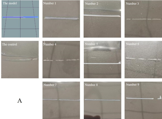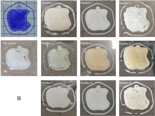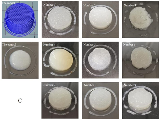 目标模型及其相应3D打印样品代表照片 (A:添加海藻酸钠的材料;B:添加黄原胶的材料;C:添加海藻酸钠/黄原胶的材料)