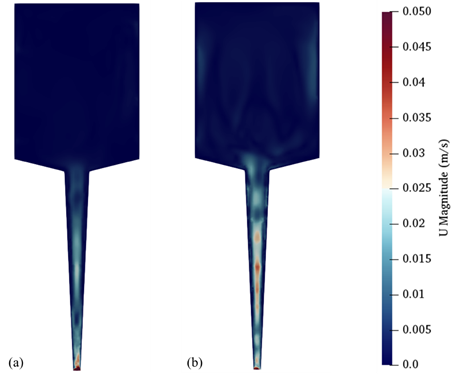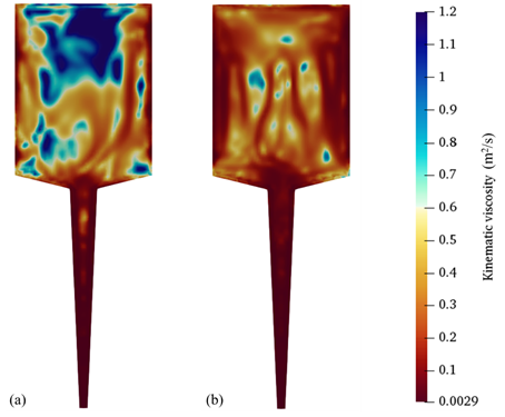 用于打印的注射器横截面上的运动粘度分布:(a) 在0.1 s时刻;(b)在2.0 s时刻
