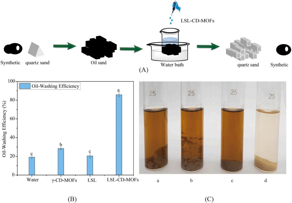 图6 LSL-CD-MOFs的洗油实验 (A-洗涤油砂示意图,B-洗油效率,C-洗涤油砂结果图)