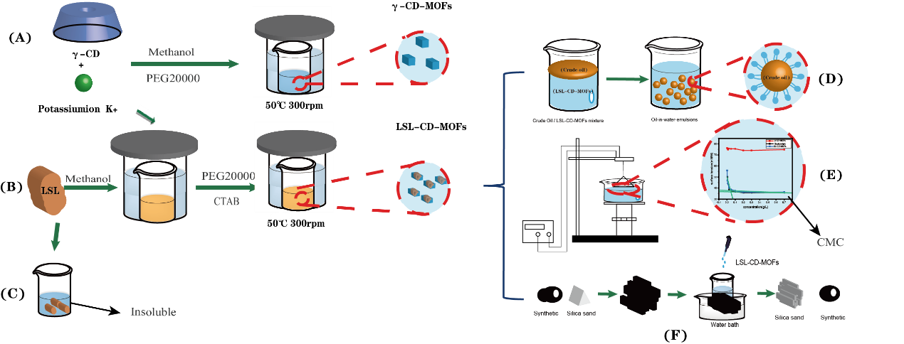 γ-CD-MOFs是一种环保型晶体和多孔材料,可作为LSL的有效载体,有效提高LSL的水溶性和驱油性能。当LSL分子被吸附到纳米颗粒内部后,高孔隙度的γ-CD-MOF晶体提供了明显的位阻,限制了LSL分子的聚集,从而提高了LSL的表观溶解度。此外,γ-CD-MOF对临界胶束浓度没有影响,但乳化指数提高了3-50倍,显著提高了降粘效率。在油砂洗油试验中,LSL-CD-MOFs的洗油效率为85.82%±2.04%,是LSL的4.2倍。总体而言,LSL-CD-MOFs作为油田EOR的环保驱油剂具有巨大的潜力。为了更好地将LSL-CD-MOFs应用于地下储层的开发,我们需要在原理结构和开采工艺方面进行进一步的研究实验。