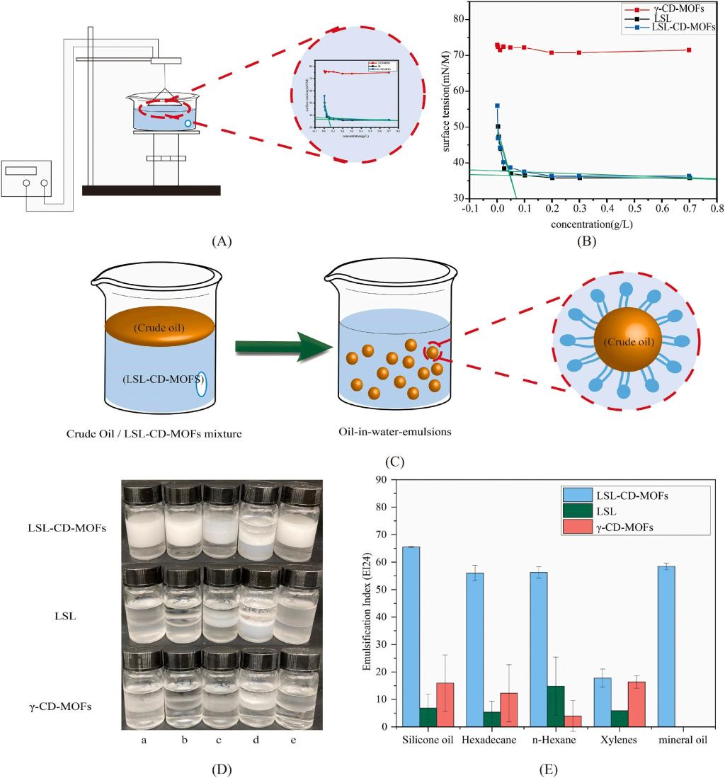 图4 γ-CD-MOFs对LSL乳化性能的主要影响。(A-表面张力,B-CMC测试,C-乳化过程示意图,D-与不同介质的乳化特性示意图,E-EI24测试结果)