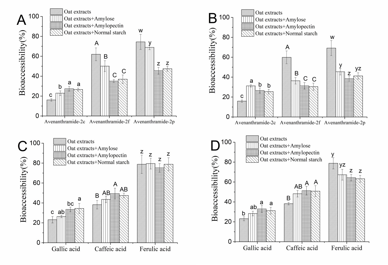 图3. 未糊化淀粉(A)和糊化淀粉(B)对燕麦提取物中2c、2f和2p三种燕麦蒽酰胺的生物可利用性的影响; 未糊化淀粉(C)和糊化淀粉(D)对燕麦提取物中没食子酸、对香豆酸和阿魏酸三种酚酸的生物可利用性的影响。每种燕麦蒽酰胺或酚酸数据上方的字母表示差异显著(p<0.05)