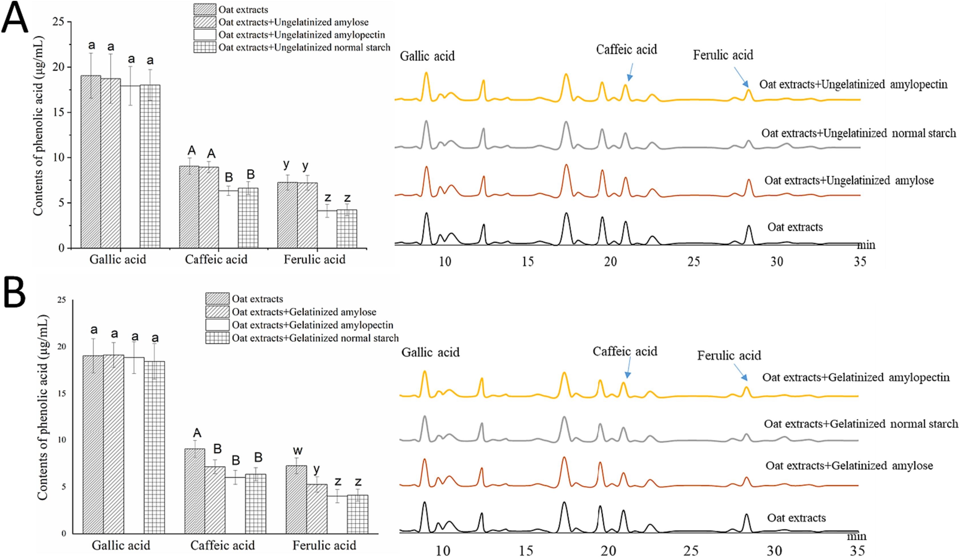 图2. 未糊化淀粉(A)和糊化淀粉(B)对燕麦提取物中没食子酸、对香豆酸和阿魏酸浓度的影响。每种酚酸数据上方的不同字母表示差异显著(p<0.05)。