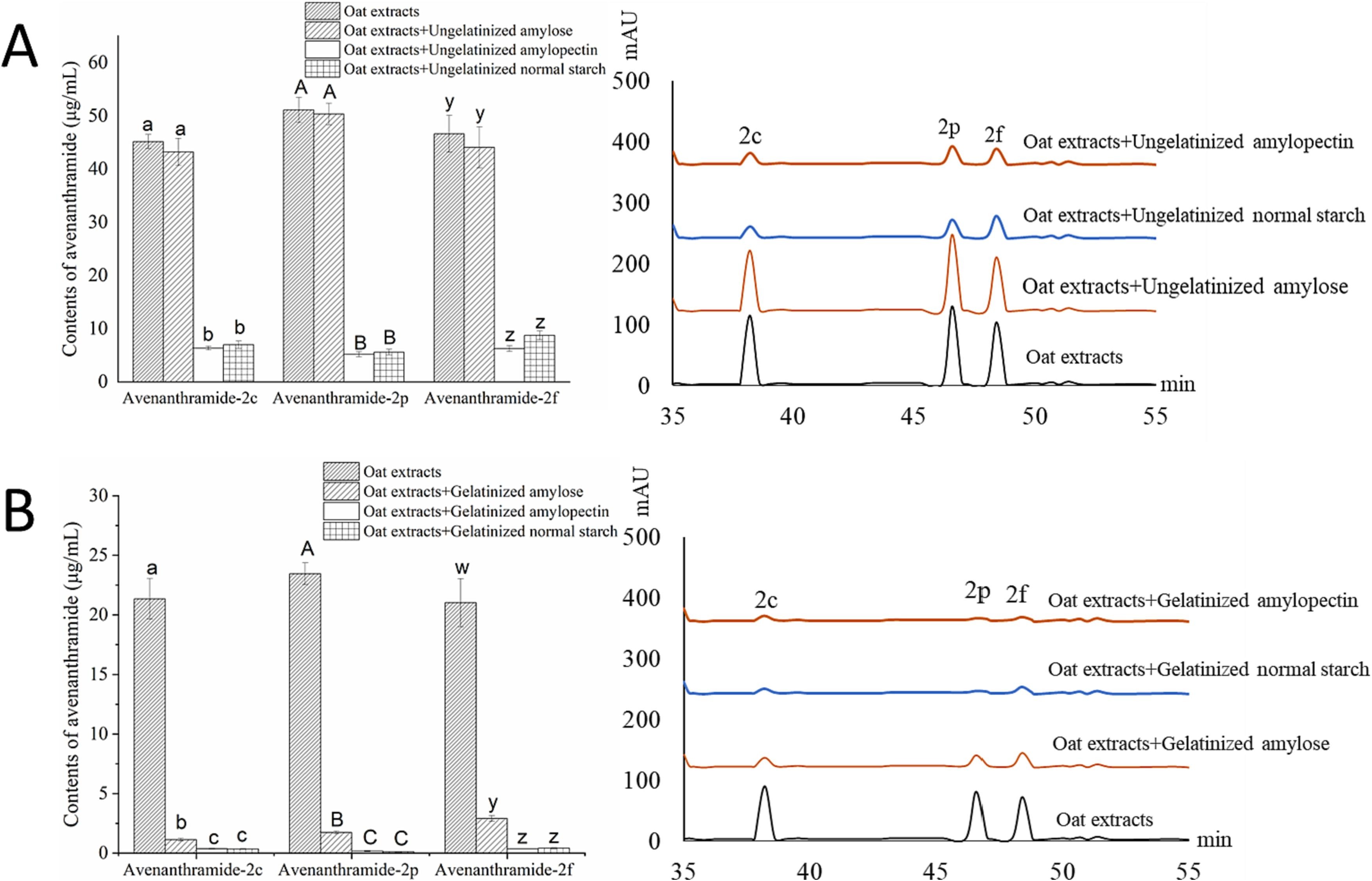 图1. 未糊化淀粉(A)和糊化淀粉(B)对燕麦提取物中2c、2f和2p型燕麦蒽酰胺浓度的影响。每种燕麦蒽酰胺数据上方的不同字母表示差异显著(p<0.05)