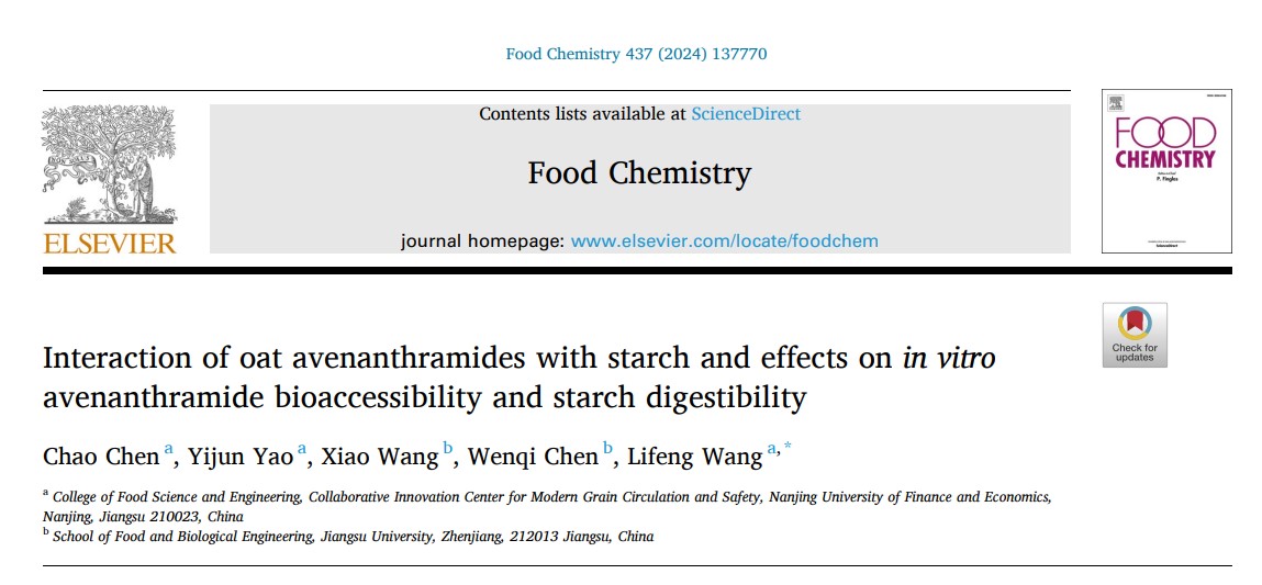 陈超(第一作者)、王立峰(通讯作者)在国际TOP期刊Food Chemistry(Q1,IF: 8.8)发表题为“Interaction of oat avenanthramides with starch and effects on in vitro avenanthramide bioaccessibility and starch digestibility”的研究性论文。